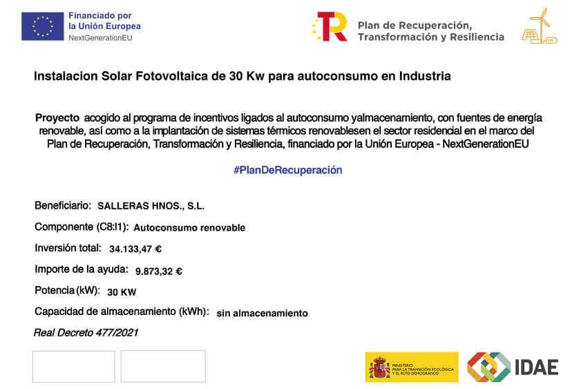 En Salleras, hemos dado un paso firme hacia la sostenibilidad con la reciente instalación de un sistema de placas solares fotovoltaicas en nuestras instalaciones. Este proyecto ha sido posible gracias al apoyo financiero de la Unión Europea a través del Plan de Recuperación, Transformación y Resiliencia, en el marco del Mecanismo de Recuperación y Resiliencia (NextGenerationEU).